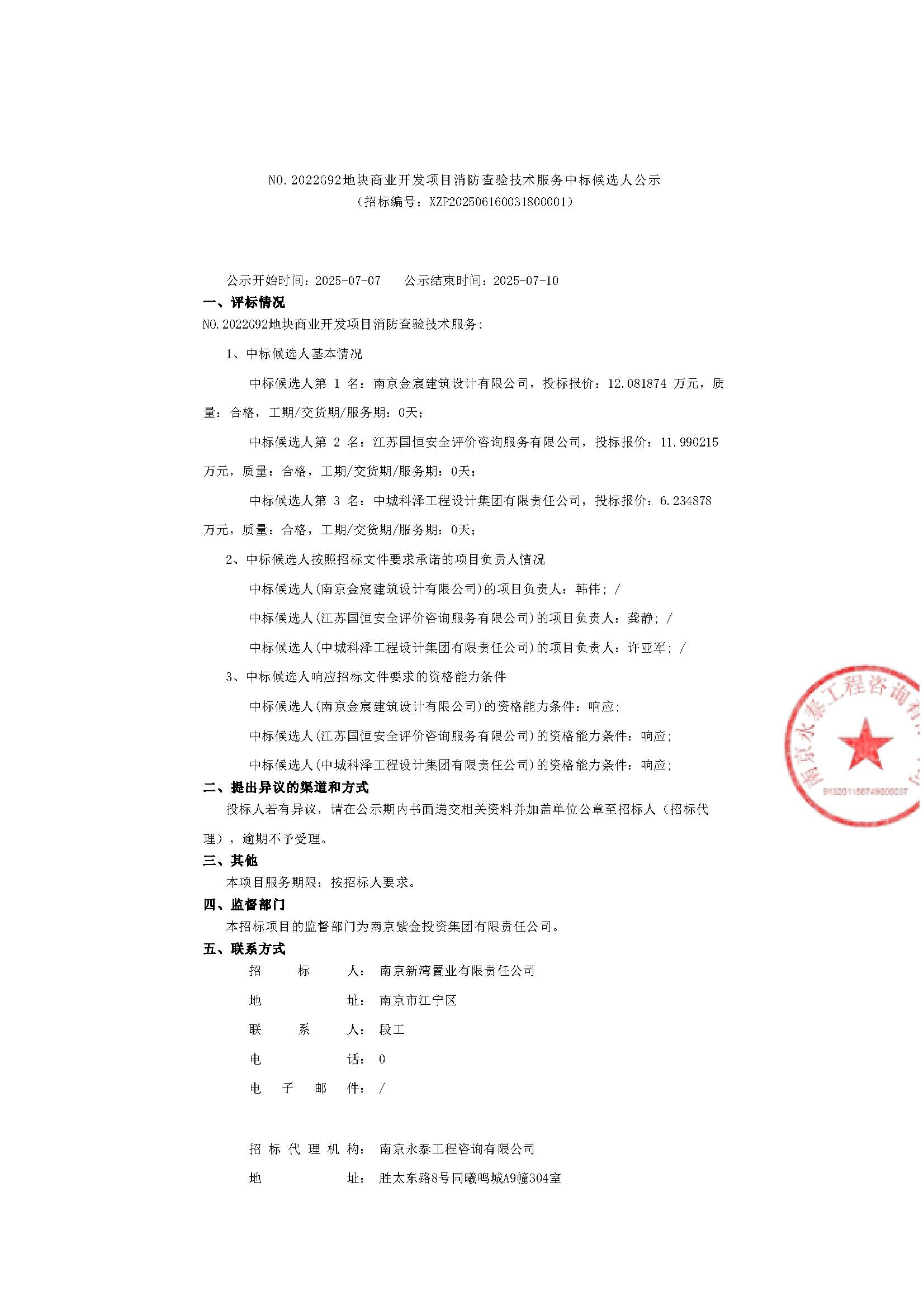 NO.2022G92地块商业开发项目消防查验技术服务中标候选人公示