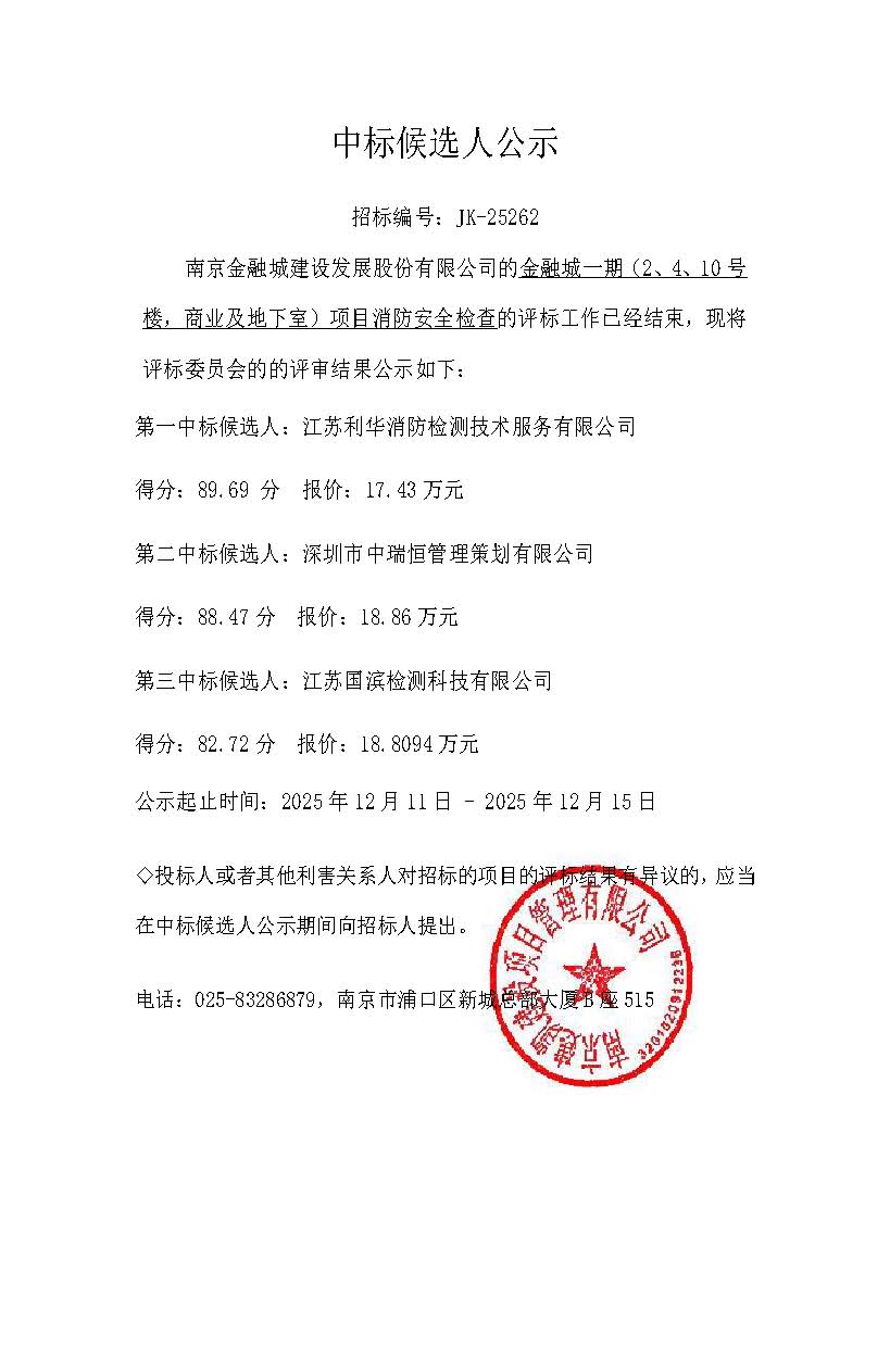 金融城一期消防安全检查服务中标候选人公示