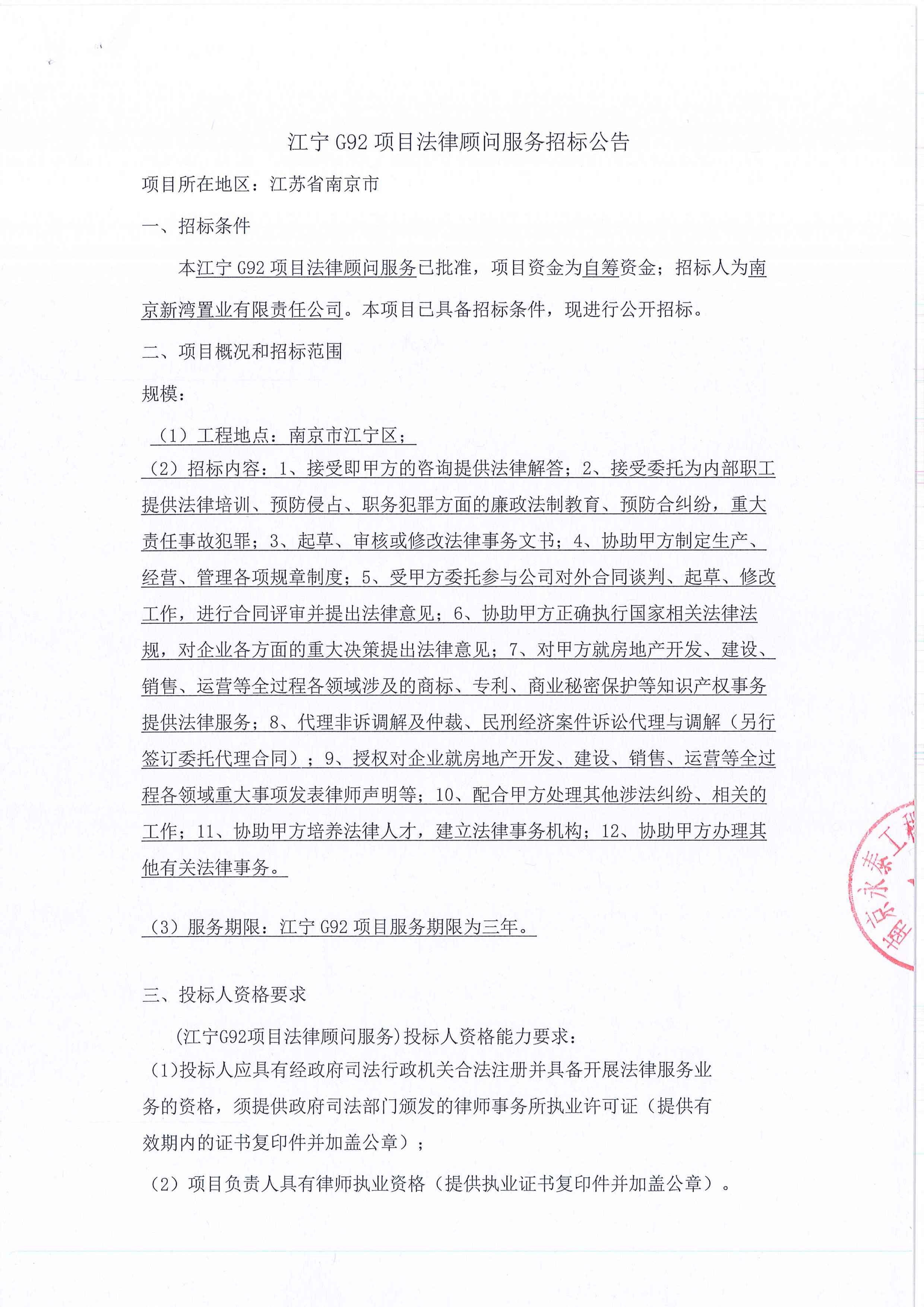 江宁G92项目法律顾问服务招标公告