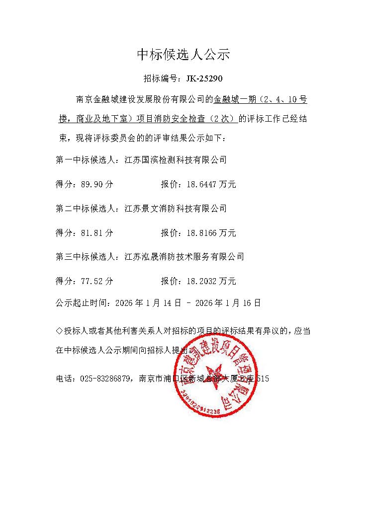 金融城一期消防安全检查服务(第2次)中标候选人公示